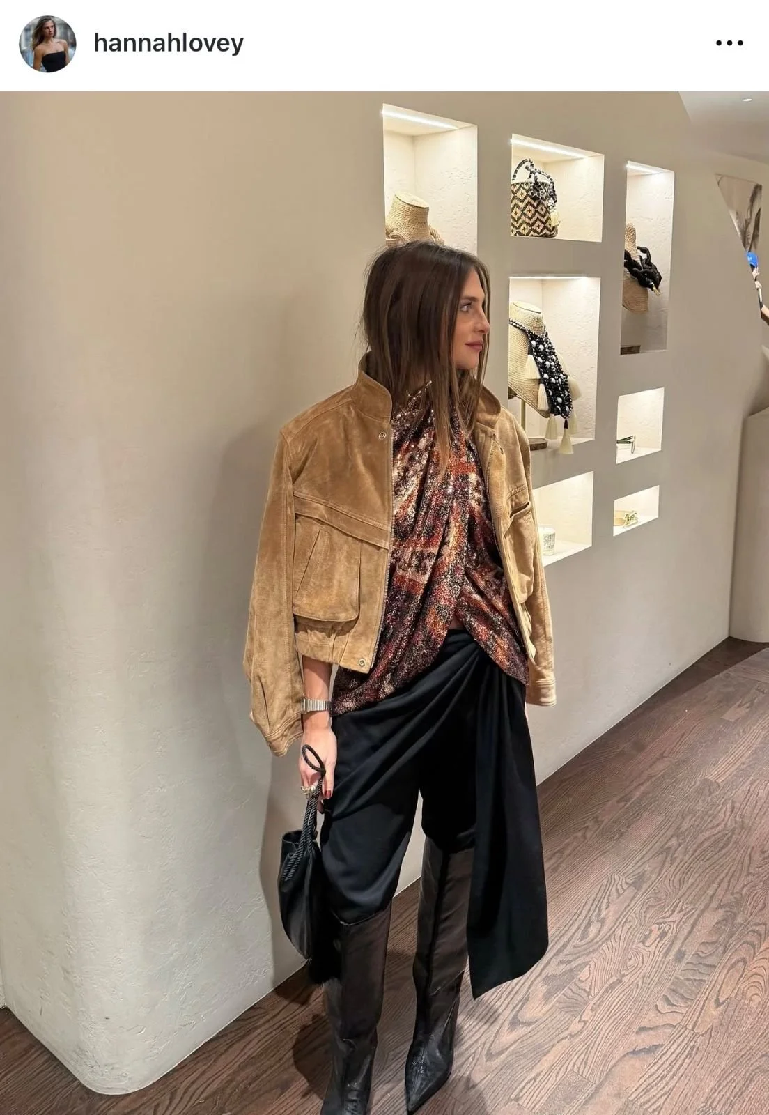 No one does it better. Every detail in Hannah’s outfit always feels effortlessly perfect. The suede jacket, sequins, rope handle bag, and leather boots all pair SO well. And the wrap trousers? Iconic.